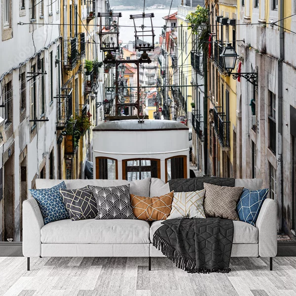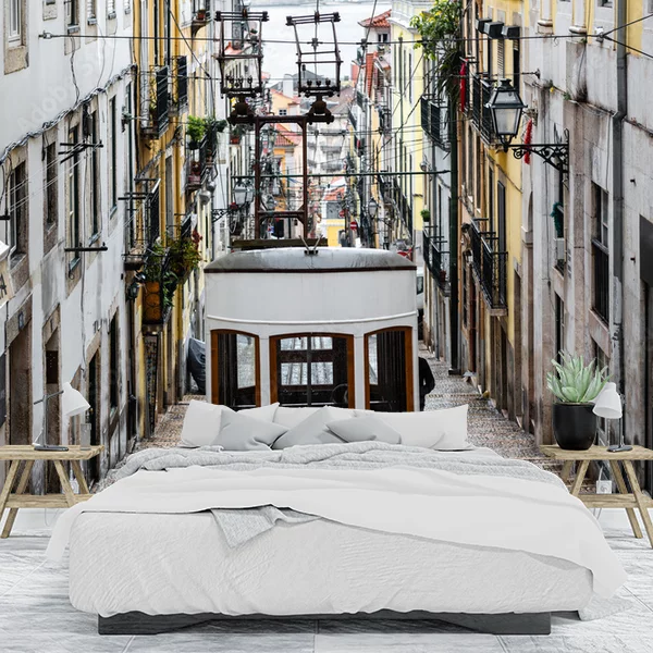 Na obrazie, który może służyć jako fototapeta na ścianę, znajduje się urokliwa uliczka w mieście, przez którą przejeżdża żółty tramwaj. Ulica prowadzi w dół, co tworzy efekt głębi. Po obu stronach ulicy stoją kolorowe, wysokie kamienice z balkonikami pełnymi kwiatów oraz praniem suszącym się na sznurkach. Tramwaj wmiejscowiony jest centralnie, a w tle widoczna jest część miasta i zarys horyzontu na końcu uliczki. Obraz emanuje europejskim klimatem z nutą nostalgii, idealnym do tworzenia klimatycznego, miejskiego akcentu w pomieszczeniu.
