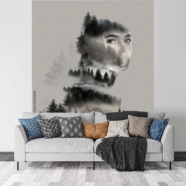 Obrazek przedstawia tajemniczą kompozycję łączącą elementy natury i tożsamości, gdzie delikatne kontury twarzy komponują się z leśnym krajobrazem. Doskonale wpasuje się do wnętrz takich jak salon czy sypialnia, dodając im nieco mistycznego i relaksującego klimatu. Drukowany na płótnie, dostępny jest na wymiar, co umożliwia dostosowanie go do każdej przestrzeni. Można go zamówić na różnorodnych materiałach, takich jak szkło plexi, płyta PCV, płótno bawełniane, poliestrowe, czy korek, co pozwala na eksperymentowanie i znalezienie idealnego rozwiązania do wystroju wnętrza.