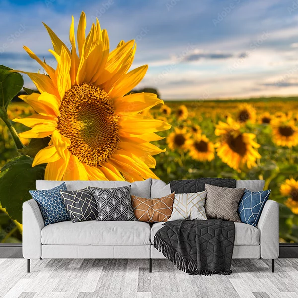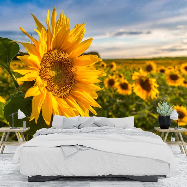 Fototapeta przedstawia piękne, letnie pole słoneczników pod błękitnym niebem. Na pierwszym planie znajduje się wyraźny, duży słonecznik o jasnożółtych płatkach, z zielonymi liśćmi delikatnie oświetlonymi promieniami słońca. W tle widać więcej słoneczników, które rozciągają się na duży obszar, tworząc malowniczy krajobraz, który doskonale oddaje urok natury i piękno letnich dni. Całość wypełnia kadr ciepłymi kolorami, wprowadzając do wnętrza ściany radość i świeżość.
