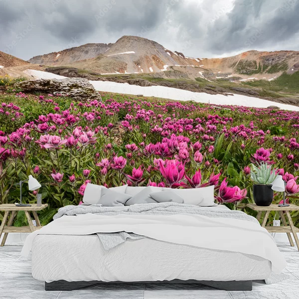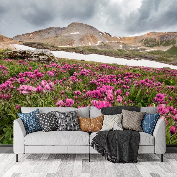 To zdjęcie idealnie nadaje się na fototapetę ścienną, przedstawiającą malowniczy krajobraz wysokogórski. Na pierwszym planie widać rozległe pole różowych kwiatów, które dodają żywych kolorów i naturalnego piękna. W tle wznoszą się majestatyczne góry, których szczyty są pokryte śniegiem. Zachmurzone niebo nadaje scenie dramatyzmu i głębi. Wizualna harmonia między kwiatami a górami tworzy spokojną, lecz imponującą atmosferę, idealną do stworzenia relaksującej przestrzeni w domu.