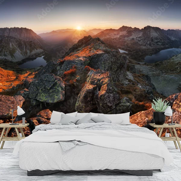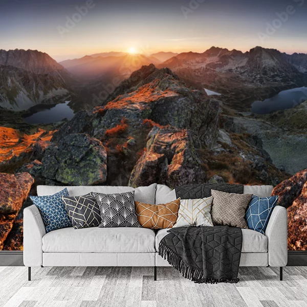 Fototapeta przedstawia malowniczy widok na górski krajobraz o zachodzie słońca. Na pierwszym planie widać surowe, skaliste formacje, które dodają zdjęciu dramatyzmu i surowości. W tle rozciągają się imponujące górskie masywy, a pomiędzy nimi lśnią jeziora, odbijające ciepłe barwy słońca. Całość jest zanurzona w złotych odcieniach, co tworzy atmosferę spokoju i majestatu. Taki obraz idealnie nadaje się na fototapetę, wprowadzając do wnętrza odrobinę dzikiej, górskiej przyrody.