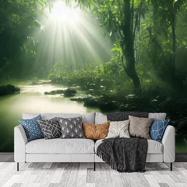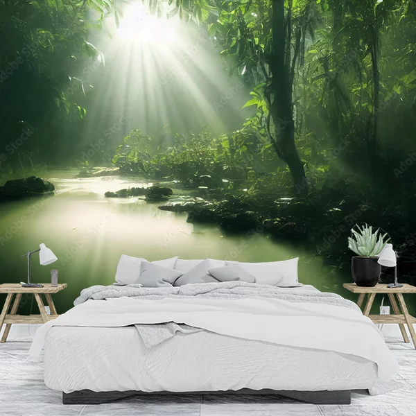 To zdjęcie przedstawia mistyczny, zielony las deszczowy, w którym promienie słońca przesączają się przez gęstą roślinność, tworząc fascynującą grę świateł i cieni. Ścieżka wodna płynąca przez spokojny krajobraz dodaje scenerii głębi i tajemniczości. Idealna fototapeta na ścianę, która wprowadza do wnętrza atmosferę spokoju i bliskości natury, tworząc jednocześnie wrażenie przestrzeni i świeżości.