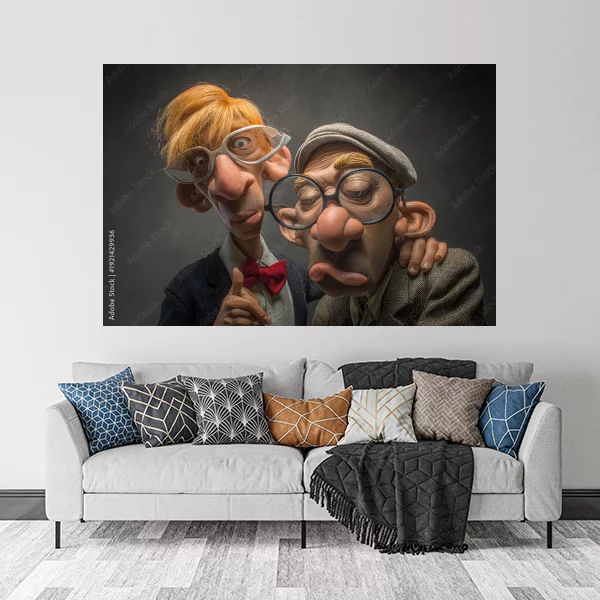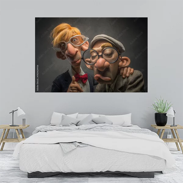 Na obrazie drukowanym na płótnie, który doskonale nadaje się do wnętrz zarówno salonu, jak i sypialni, przedstawiono dwie postacie o wyrazistych i zabawnych cechach. Dzięki szerokiej dostępności na wielu materiałach, takich jak szkło plexi, płyta PCV, płótno bawełniane czy poliestrowe, obraz ten można idealnie dostosować do swoich potrzeb. Dodatkowo, istnieje możliwość wydruku na korku, co nadaje mu oryginalnego charakteru, lub na płycie Dibond, zapewniając wyjątkową trwałość.