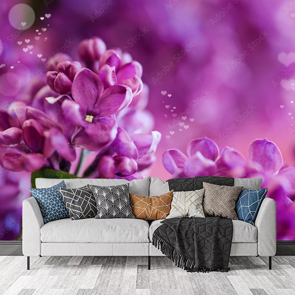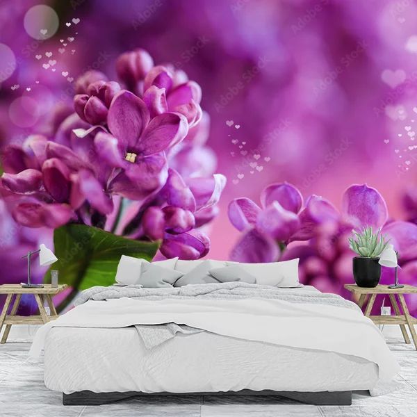 Na obrazie widnieje zbliżenie na piękne, fioletowe kwiaty bzu, które są głównym motywem. Tło jest rozmyte w odcieniach fioletu, co nadaje całości głębi i stwarza wrażenie przestrzeni. Dodatkowo na tle można dostrzec delikatne, białe serduszka i bokeh, które dodają obrazu romantycznego i delikatnego charakteru. Liście kwiatu są zielone i wyraźne, co kontrastuje z dominującymi odcieniami fioletu. Taka fototapeta idealnie nada się na ścianę, wprowadzając do wnętrza subtelny i elegancki akcent natury.