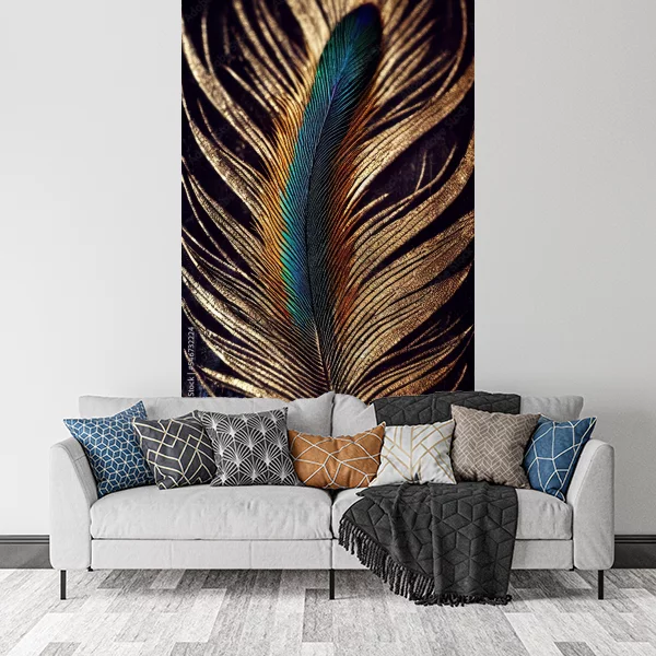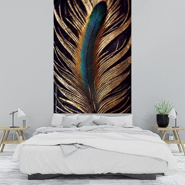Obraz przedstawia efektownie przedstawione pióro z motywem pawim. Centralnym elementem jest pióro o intensywnych kolorach: głębokim zielonym z odcieniami niebieskiego, które kontrastuje z otaczającym je złotym wzorem. Tło jest ciemne, co dodatkowo podkreśla blask i elegancję złotych elementów. Całość tworzy luksusowy i stylowy efekt, idealny do dekoracji wnętrza.