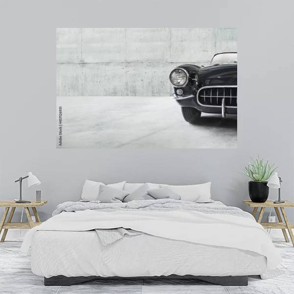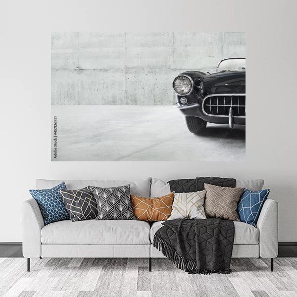 Obraz przedstawia stylowy fragment klasycznego samochodu na tle surowej, betonowej ściany. Jego elegancki, czarny lakier oraz wyraziste chromowane elementy przyciągają uwagę i dodają nuty retro elegancji. Taka grafika idealnie komponuje się z nowoczesnymi wnętrzami, stanowiąc doskonały dodatek zarówno do salonu, jak i sypialni. Obraz drukowany na płótnie jest dostępny na zamówienie na wiele wymiarów, dostosowując się do indywidualnych potrzeb przestrzeni.