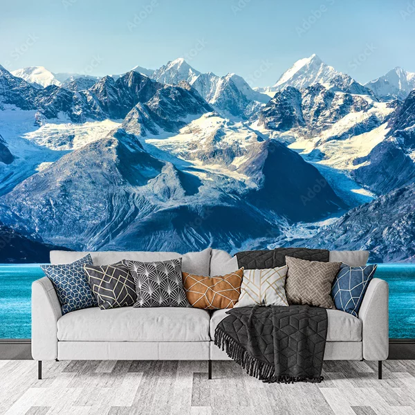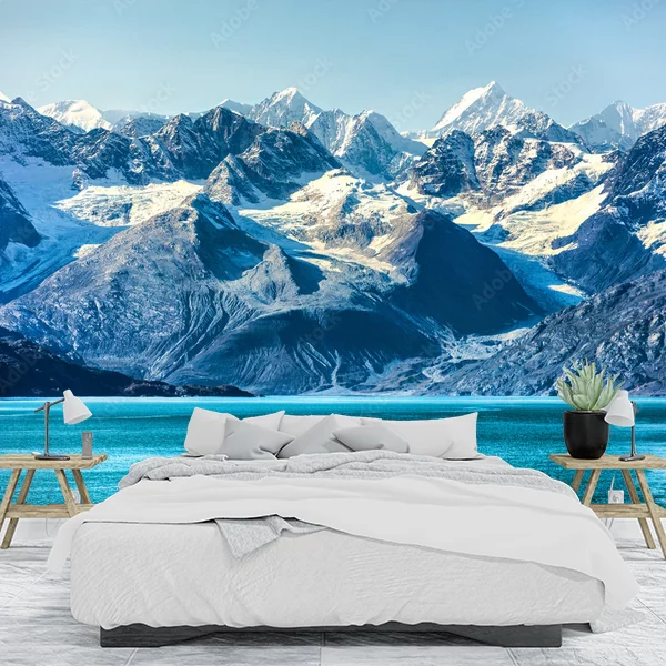 Ta fototapeta przedstawia spektakularny krajobraz górski z ośnieżonymi szczytami i lodowcami w tle. Na pierwszym planie widać spokojne, turkusowe jezioro, które kontrastuje z surowymi, skalistymi zboczami. Pogodne niebo dopełnia poczucia spokoju i przestronności. Tego rodzaju obraz idealnie nadaje się na dużą ścianę, tworząc iluzję podziwiania alpejskich widoków prosto z salonu. Taka sceneria wnosi do wnętrza element natury, świeżości i monumentalności.