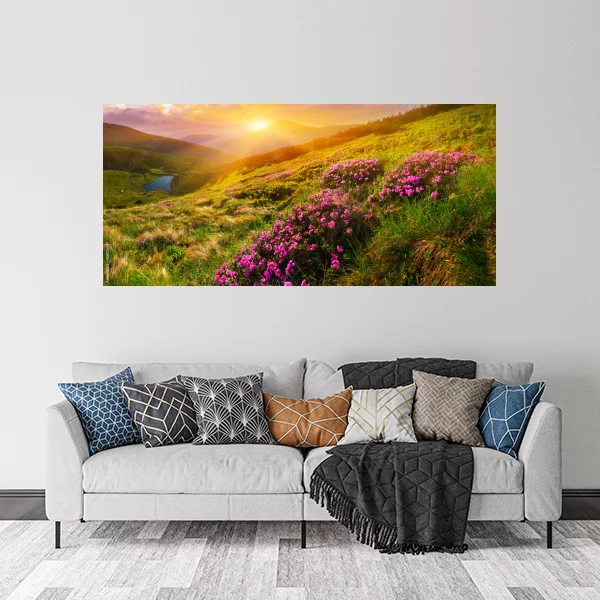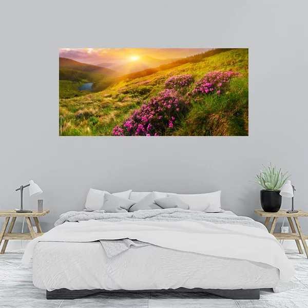 Obraz przedstawia malowniczy krajobraz górski o świcie. Widok zachwyca wschodzącym słońcem, które oświetla zielone wzgórza i kolorowe kwiaty rododendronów. To idealna dekoracja do wnętrz, zarówno do salonu, jak i do sypialni. Każdy detal oddany jest z niezwykłą precyzją, co sprawia, że patrzenie na ten obraz przenosi nas wprost na łono natury.