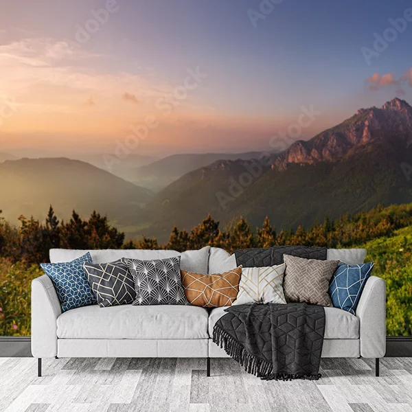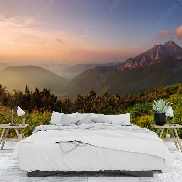 Ta fototapeta przedstawia malowniczy krajobraz górski o świcie. Po lewej stronie widać słońce pośród pastelowych chmur, oświetlające delikatnie doliny i wzniesienia. Centrum sceny zajmuje majestatyczna góra, której szczyt tonie w niewielkich obłokach. Przedgórze pokrywa bujna, zielona roślinność dodająca żywości i naturalnego piękna kompozycji. Taki obraz stwarza relaksującą, harmonijną atmosferę, idealną do wnętrz, w których chce się poczuć bliskość z naturą.