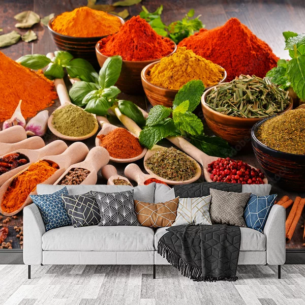 Na obrazie widzimy mnóstwo aromatycznych przypraw i ziół, które są doskonałym wyborem na fototapetę do kuchni lub jadalni. Na drewnianym stole znajdują się miseczki i drewniane łyżki wypełnione kolorowymi przyprawami, takimi jak kurkuma, papryka, curry, pieprz, zioła prowansalskie i inne mieszanki przyprawowe. W tle widoczne są świeże liście ziół, takie jak bazylia i mięta, które dodają zielonego akcentu do całej kompozycji. Całość tworzy barwną i apetyczną scenę, która wprowadza ciepły, kuchenny klimat i może pobudzić nasze zmysły do eksperymentów kulinarnych. To piękny i inspirujący motyw dekoracyjny na ścianę.