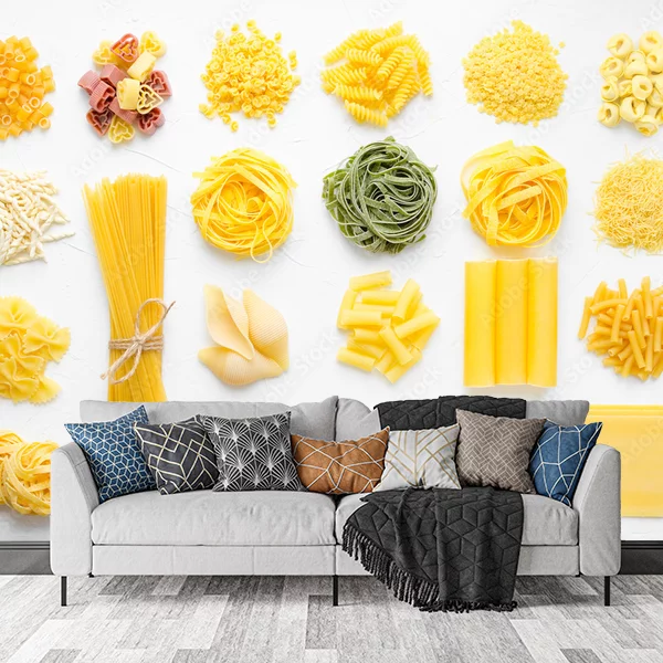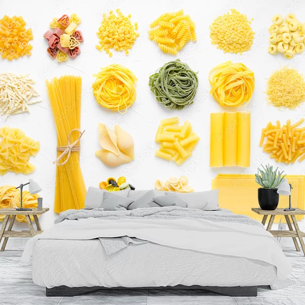 Fototapeta przedstawia różne rodzaje surowego makaronu rozłożonego na jasnym tle. Można zobaczyć różnorodne kształty i kolory makaronu, w tym popularne spaghetti, tagliatelle, fusilli, penne, farfalle, tortellini, rigatoni, a także kolorowy makaron w formie kokardek i muszli. Każdy rodzaj makaronu jest starannie rozłożony, co daje wrażenie porządku i różnorodności. Użycie jasnego tła podkreśla ciepłe, złociste odcienie makaronu, tworząc estetycznie przyjemną kompozycję. Taka fototapeta może być doskonałą dekoracją do kuchni lub jadalni, wprowadzając kulinarną atmosferę i inspirując do gotowania.