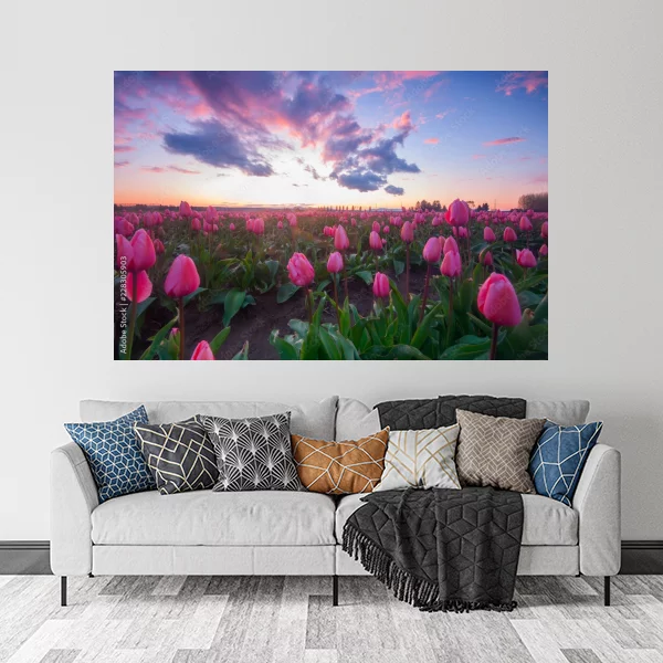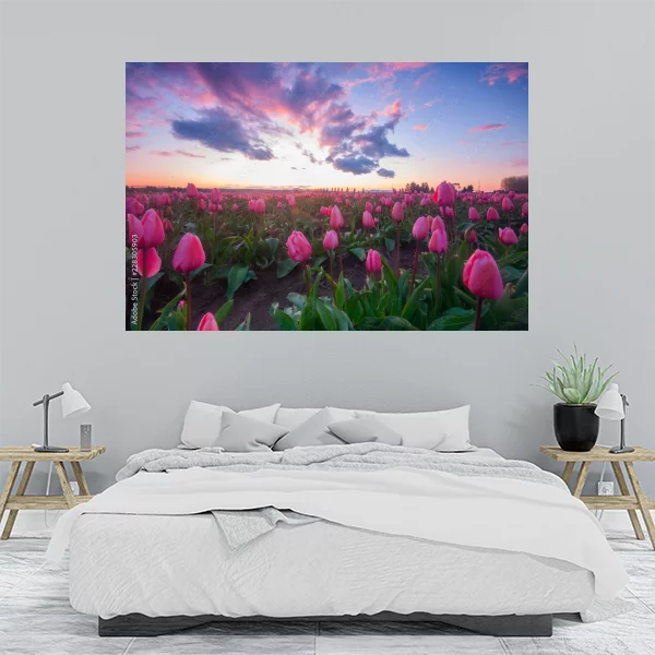 Ten obrazek przedstawia malowniczy krajobraz zachodu słońca nad polem tulipanów. Intensywne kolory różu, fioletu i błękitu tworzą romantyczną atmosferę idealną do wnętrz domu. Obraz drukowany na płótnie będzie doskonałym dodatkiem do salonu, dodając mu ciepła i przytulności, lub do sypialni, wprowadzając spokojny klimat.