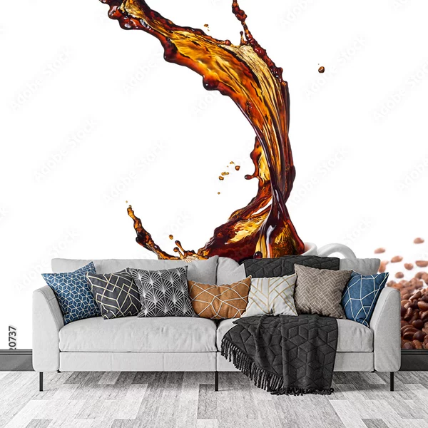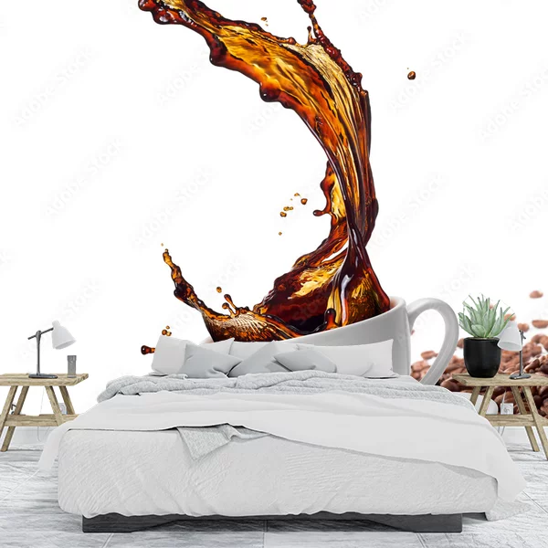 Na obrazie przedstawiona jest biała filiżanka wypełniona kawą, z której dynamicznie rozpryskuje się płyn w dramatycznym łuku. Filiżanka stoi na białym talerzyku umieszczonym na stosie ziaren kawy, które pokrywają dolną część obrazu. Tło jest jednolite i białe, co podkreśla kontrast brązu kawy i ziaren. Kompozycja obrazu daje wrażenie ruchu oraz energii, co może być atrakcyjne jako fototapeta na ścianę, szczególnie w kuchni, kawiarni albo jadalni.