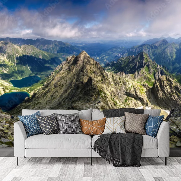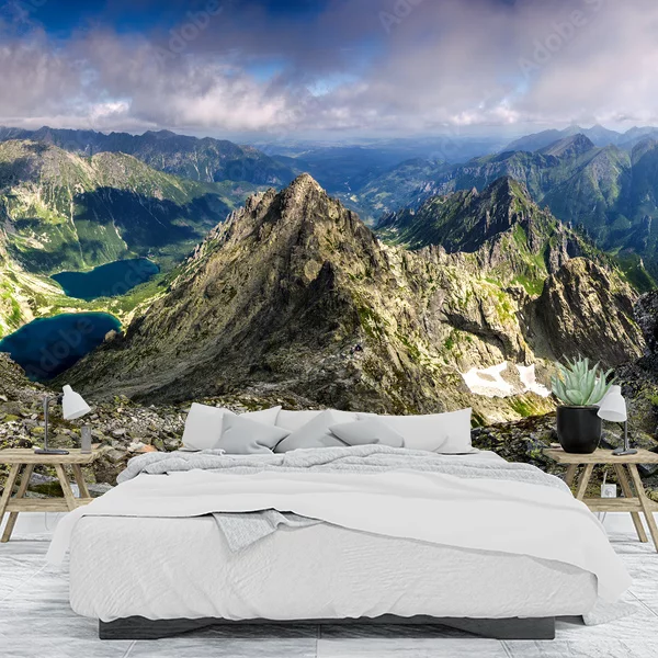 Obraz przedstawia spektakularny panoramiczny widok na górski krajobraz. Na pierwszym planie widać szczyty górskie o ostro zarysowanych krawędziach, pokryte w niektórych miejscach trawą i kamieniami. W dali rozciąga się szeroka dolina, a w niej widoczne są mniejsze jeziorka o intensywnym, błękitnym kolorze. Góry są ozdobione jaskrawymi plamami słońca, które przeplatają się z cieniami chmur unoszących się nad szczytami. Niebo jest częściowo pochmurne, ale miejscami prześwituje błękit nieba dodający głębi i kontrastu całemu pejzażowi. Taka fototapeta na ścianę doskonale oddaje majestatyczność natury i zapewnia poczucie przestrzeni, co sprawia, że wnętrze zyskuje wyjątkowy i inspirujący charakter.