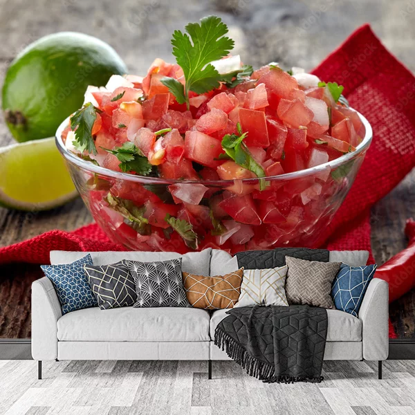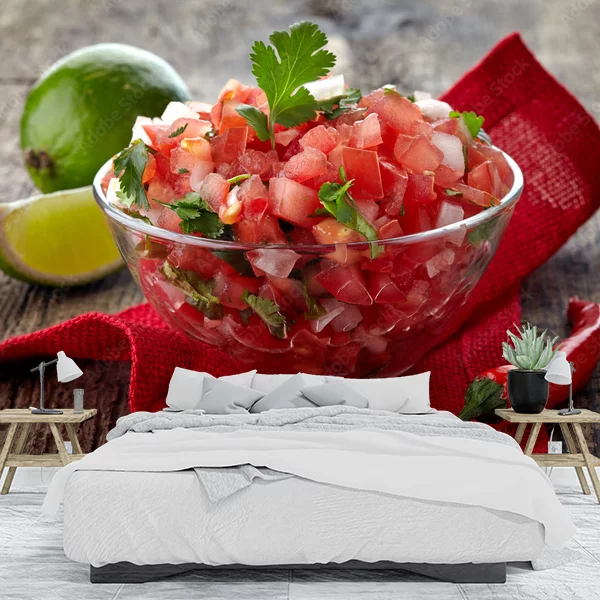 Na obrazie znajduje się miska świeżo przygotowanej salsy, składającej się z drobno pokrojonych pomidorów, cebuli i kolendry. Miska stoi na czerwonej serwetce, która dodaje ciepłego, żywego akcentu do kompozycji. Obok miski znajduje się limonka oraz czerwona papryczka chili, co sugeruje potencjalne składniki salsy, nadające jej pikantny smak. Tło jest drewniane, co tworzy rustykalny, naturalny klimat. Kolory są żywe i apetyczne, idealne do użycia jako fototapeta w kuchni lub jadalni, aby dodać wnętrzu energii i świeżości.