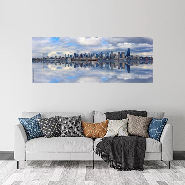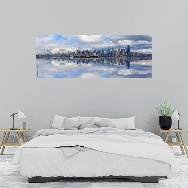 Obrazek przedstawia panoramiczny widok miasta odbijającego się w spokojnych wodach, co tworzy harmonijną i niezwykle efektowną kompozycję. Taki obraz drukowany na płótnie doskonale nadaje się do wnętrz, dodając nowoczesnego i eleganckiego charakteru każdej przestrzeni. Idealny do salonu, gdzie będzie przyciągać uwagę gości, ale także świetnie sprawdzi się w sypialni, wprowadzając spokojną atmosferę. Obraz dostępny jest w różnych wymiarach, co pozwala łatwo dopasować go do konkretnej przestrzeni.