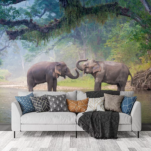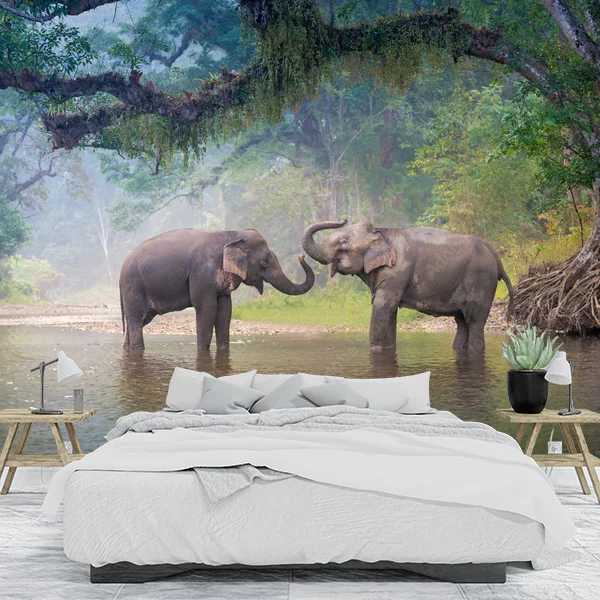 Fototapeta przedstawia dwa słonie stojące w płytkiej wodzie, w naturalnym lśniącym krajobrazie lasu. Scena jest zanurzona w delikatnej mgiełce, co dodaje mistycznego i spokojnego charakteru. Słonie stoją naprzeciwko siebie, z trąbami uniesionymi w geście interakcji lub zabawy. W tle widoczne są gęsto porośnięte drzewa, których gałęzie i korzenie dodają głębi i struktury obrazowi. Ta fototapeta będzie pięknym elementem dekoracyjnym, dodającym natury i egzotycznego uroku wnętrzu.