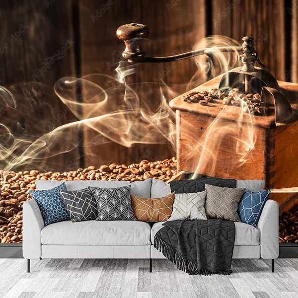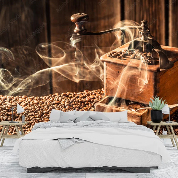 Obraz przedstawia klasyczny, drewniany młynek do kawy, otoczony świeżo zmielonymi i całymi ziarnami kawy. Młynek jest umieszczony na stole pokrytym ziarnami kawy, a z jego otwartego szufladki wydobywa się aromatyczna para, co dodaje uczucia świeżo zmielonej kawy. W tle widać drewnianą ścianę, co dodaje rustykalnego klimatu. Całość kompozycji przyciąga uwagę miłośników kawy i tworzy ciepłą, przytulną atmosferę idealną na fototapetę do kuchni, kawiarni czy jadalni.