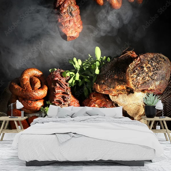 Na obrazie widzimy bogatszą kompozycję różnych wędlin, które mogą stanowić atrakcyjny motyw fototapety na ścianę. W centralnej części znajdują się różne rodzaje wędzonych mięs, takie jak kiełbasa, szynka oraz kaszanka. Wędliny są ułożone na ciemnym tle, co sprawia, że ich naturalne kolory są dobrze widoczne i intensywne. W górnej części obrazu wiszą wędzone kiełbasy, co dodaje kompozycji głębi i struktury. Dym unoszący się nad jedzeniem potęguje wrażenie świeżości i autentyczności.