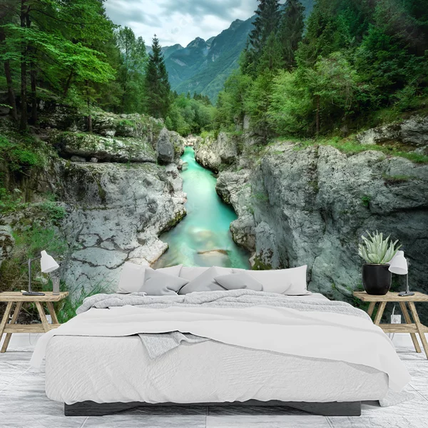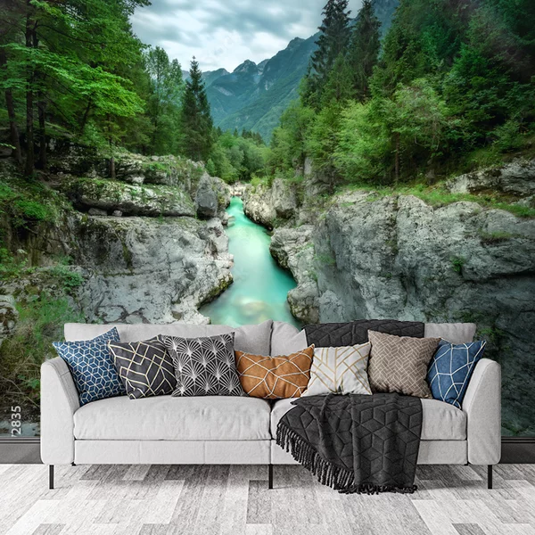 Fototapeta do salonu lub sypialni przedstawia malowniczy krajobraz z górskim strumieniem płynącym przez wąwóz. Krystalicznie czysta turkusowa woda przecina między wysokimi, szarymi skałami, tworząc imponujące zestawienie barw. Wokół znajdują się bujne zielone drzewa, które dodają naturalnego uroku i kontrastu. W tle widać zarys gór, które nadają pejzażowi majestatyczny charakter. Całość tworzy spokój i przyciąga uwagę, co sprawia, że jest to idealny wybór na fototapetę do wnętrza, które ma inspirować i uspakajać.