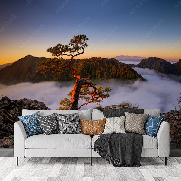 W tle za drzewem rozpościerają się góry, a doliny między nimi są wypełnione puszystymi chmurami lub mgłą, co dodaje całemu widokowi mistycznego uroku. Po lewej stronie widać fragment horyzontu z zachodzącym lub wschodzącym słońcem, które barwi obłoki na ciepłe odcienie pomarańczu i złota.