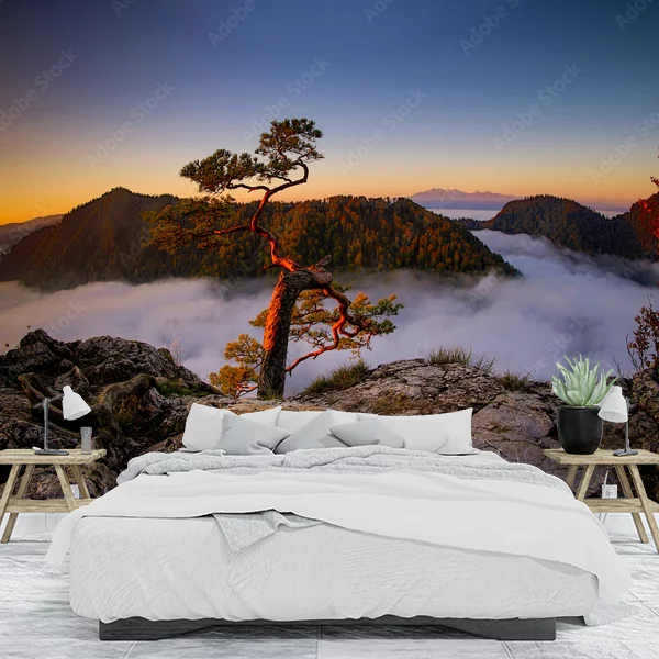 Na obrazie, który może być idealnym produktem jako fototapeta na ścianę, widzimy malowniczy krajobraz górski. Na pierwszym planie znajduje się samotne, skręcone drzewo rosnące na skalistym szczycie. Scena jest oświetlona miękkim światłem wschodzącego lub zachodzącego słońca, które nadaje niebu gradient od ciepłego pomarańczowego do głębokiego niebieskiego.