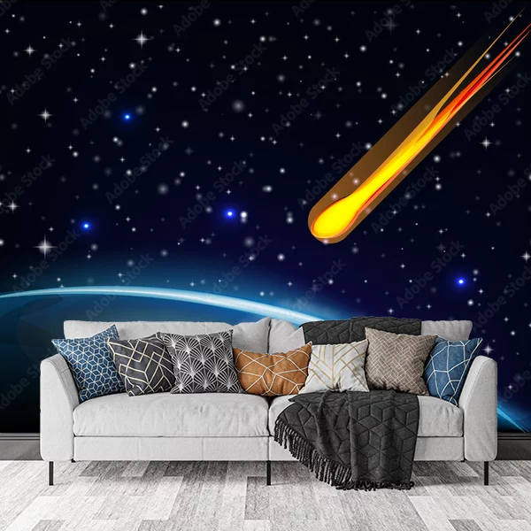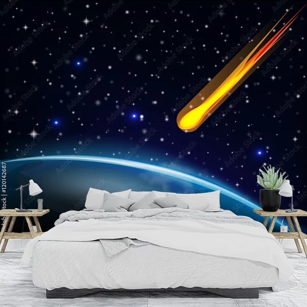 Obraz przedstawia ujęcie kosmosu z widokiem na planetę Ziemię oraz lecącą kometę. Na pierwszym planie widać fragment planety z charakterystycznym niebieskim odcieniem atmosfery. Na tle gwieździstego nieba, po prawej stronie obrazu, kometa z wyraźnym, jasnoświecącym jądrem i długim ogonem rozświetla mrok kosmosu. Gwiazdy w różnorodnych odcieniach niebieskiego i białego zdobią tło, tworząc fascynującą scenerię. Taka fototapeta na ścianę znakomicie nadaje się do pokoju miłośnika astronomii lub nowoczesnych, stylowych wnętrz, przynosząc wrażenie głębi i tajemniczości.