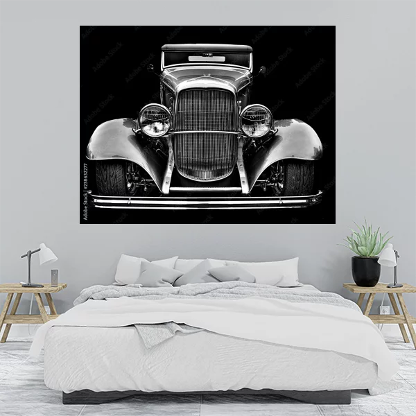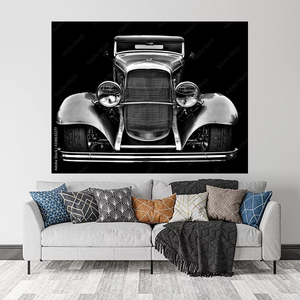 Oto elegancki obraz przedstawiający klasyczny samochód w stylu retro, idealny jako drukowany na płótnie dekoracja na ścianę do wnętrz. Subtelna gra cieni i świateł dodaje temu motywowi głębi i wyrazistości, co sprawia, że będzie doskonałym uzupełnieniem w salonie lub sypialni. Obraz dostępny jest na wymiar, aby idealnie dopasować się do Twojego wnętrza. Wykonany na wielu nowoczesnych materiałach, takich jak szkło plexi, płyta PVC, wysokiej jakości płótno bawełniane lub poliestrowe, a także na korku.