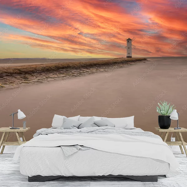 Na obrazie, który można by wykorzystać jako fototapetę na ścianę, widoczny jest malowniczy pejzaż przybrzeżny. Na pierwszym planie można dostrzec spokojną, rozmytą powierzchnię wody, prawdopodobnie z efektem długiego naświetlania, co dodaje zdjęciu mistycznego charakteru. W tle znajduje się wąska, kamienista grobla prowadząca do latarni morskiej. Latarnia mieni się białym kolorem i znajduje się po prawej stronie kadru, na tle spektakularnych, intensywnie pomarańczowo-różowych chmur, które pokrywają niemal całe niebo. U dołu nieba widać fragment błękitnego horyzontu przechodzącego w subtelne pasmo zachodu słońca o ciepłych barwach. Całość kompozycji tworzy spokojną, jednakże bardzo nastrojową i dynamiczną scenę morską, idealną na fototapetę, która może nadać wnętrzu przestrzenności i niepowtarzalnego klimatu.