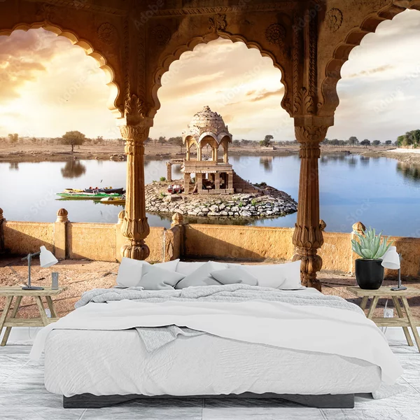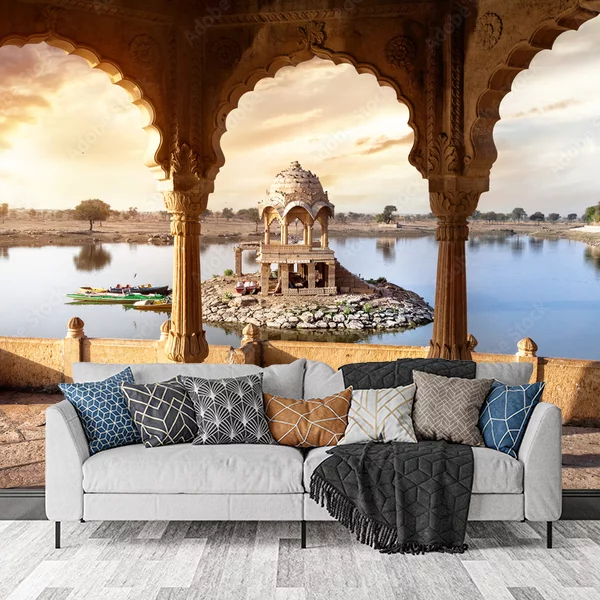 Fototapeta przedstawia malowniczy krajobraz z widokiem na jezioro w Indiach. W centrum obrazu znajduje się ozdobny, kamienny pawilon, umiejscowiony na małej wysepce otoczonej wodą. Pawilon ma bogato zdobioną kopułę oraz filary. Na pierwszym planie widać taras z kolumnami i łukowymi przejściami, zapewniający piękny widok na jezioro i pawilon. Z lewej strony jeziora znajduje się mała łódź z kolorowymi elementami. W tle rozciąga się spokojny krajobraz z drzewami i delikatnymi wzgórzami. Kolory są ciepłe, z zachodzącym słońcem, które dodaje scenerii wyjątkowego nastroju. To idealna dekoracja na ścianę, która wprowadzi egzotyczny i relaksujący klimat do wnętrza.
