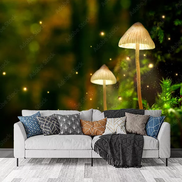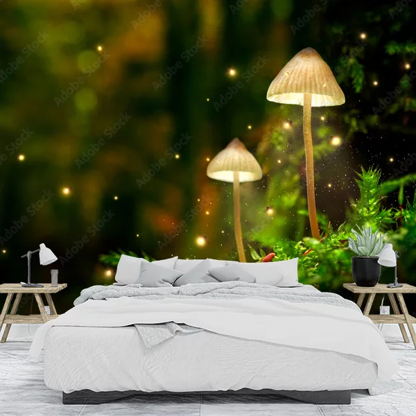 Prezentowany obraz jest idealnym dodatkiem jako fototapeta na ścianę, który wprowadza do wnętrza magiczną, leśną atmosferę. Na obrazie widoczne są dwa delikatne, jasne grzyby rosnące na tle bujnej zieleni mchu i roślin. Wokół grzybów unoszą się niewielkie, świecące punkty przypominające świetliki, które dodają całości bajkowego i tajemniczego charakteru. Tło obrazu jest rozmyte, co jeszcze bardziej podkreśla centralne elementy i wprowadza wrażenie głębi. Soczyste kolory zieleni oraz delikatne, ciepłe światło sprawiają, że ta fototapeta wniesie do każdego wnętrza niezwykłą aurę natury i spokoju.