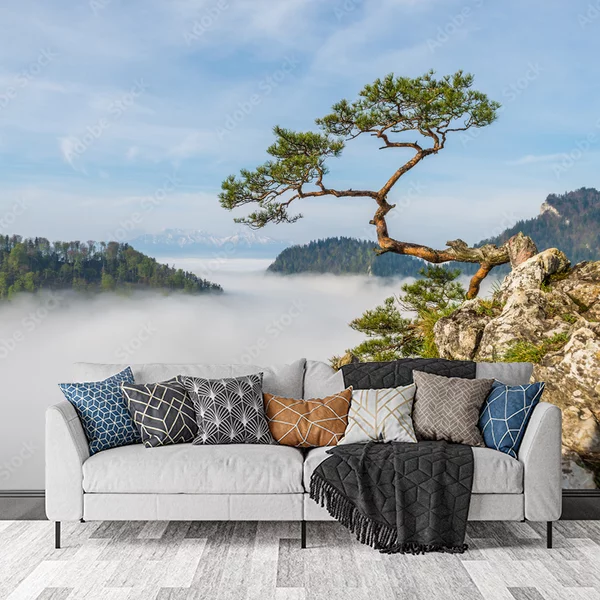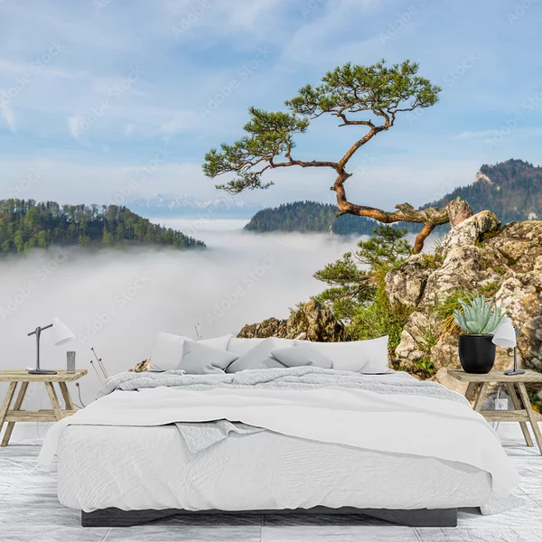 Ta fototapeta przedstawia malowniczy krajobraz górski z charakterystycznym samotnym drzewem rosnącym na skraju skalistego urwiska. Drzewo zdaje się wyłaniać z porannej mgły, co nadaje całości mistycznego charakteru. W tle widać rozciągające się w oddali góry porośnięte lasem. Kompozycja jest harmonijna, a łagodna paleta kolorów sprzyja poczuciu spokoju i wyciszenia. Taka fototapeta świetnie sprawdzi się w salonie lub sypialni, nadając wnętrzu przytulności i naturalnego piękna.