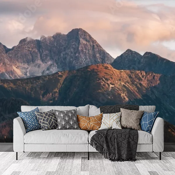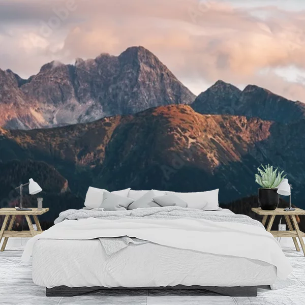 Fototapeta przedstawia majestatyczny widok górskich szczytów o zmierzchu. Potężne, skaliste wierzchołki są delikatnie oświetlone złotymi promieniami zachodzącego słońca, co tworzy ciepły kontrast z ciemniejszymi, zacienionymi dolinami i stokami. Chmury nad górami są lekko różowe i świetliste, dodając uroku całej scenerii. Taka fototapeta idealnie nadaje się do salonu lub sypialni, wprowadzając element natury i spokoju do wnętrza.
