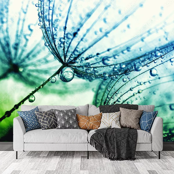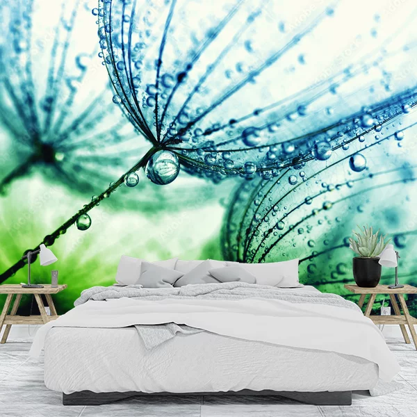 Na obrazie znajduje się przekroczona makrofotografia trzech dmuchawców pokrytych kroplami wody. Zdjęcie jest wykonane z bliska, pokazując delikatną strukturę i szczegóły puchowych nasion dmuchawca. Kolory dominujące na obrazie to odcienie zieleni i błękitu, co nadaje całości świeży i naturalny wygląd. Taka fototapeta może dodać wnętrzu spokoju i wyjątkowej atmosfery, przywodząc na myśl świeżość wiosennego poranka.