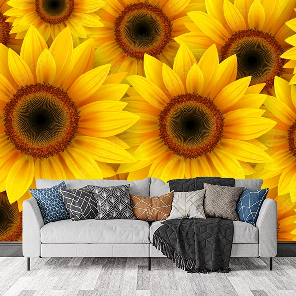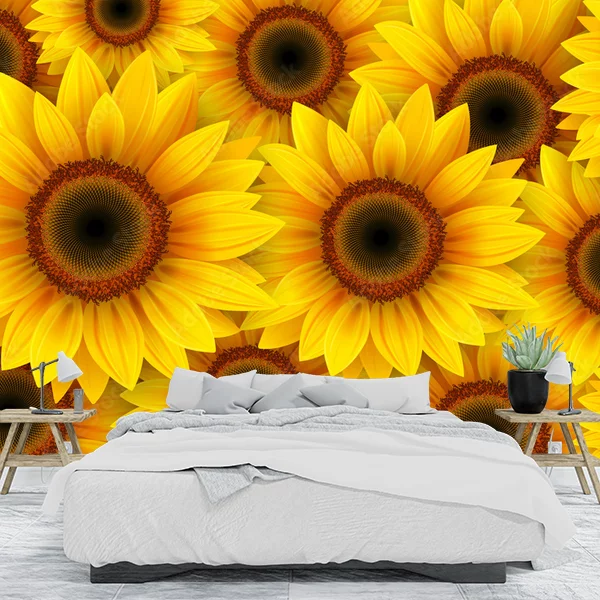 Na obrazie, który może posłużyć jako produkt/fototapeta na ścianę, widocznych jest wiele słoneczników. Kwiaty te mają duże, okrągłe środki w kolorze ciemnobrązowym, otoczone przez intensywnie żółte płatki. Układ słoneczników na obrazie jest gęsty, co sprawia, że całość wygląda jak dywan złożony z tych kwiatów. Obraz jest pełen jasnych, ciepłych barw i może dodać pomieszczeniu radosnego i żywego charakteru.