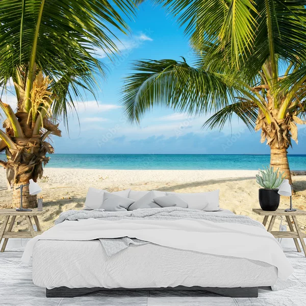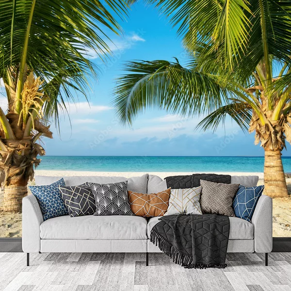 Obraz przedstawia malowniczy, tropikalny krajobraz idealny na fototapetę. Na pierwszym planie widoczne są dwie smukłe palmy, które rosną na piaszczystej plaży. W tle rozciąga się lazurowe morze, którego spokojne fale sięgają horyzontu. Całość jest skąpana w ciepłym, słonecznym świetle, a niebo jest jasne, z delikatnymi obłokami. Taka fototapeta wprowadza do wnętrza egzotyczny klimat i poczucie relaksu.
