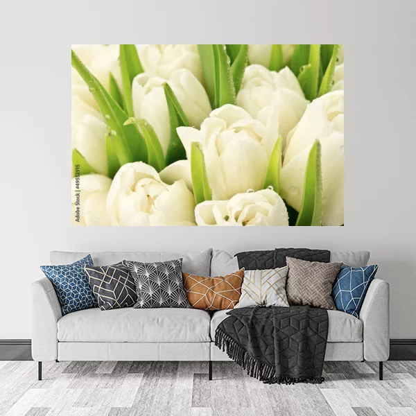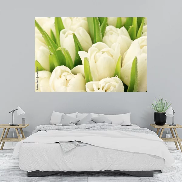 Obraz na płótnie przedstawiający piękne, białe tulipany. Te delikatne kwiaty, otoczone soczystą zielenią liści, są uchwycone na tle, które dodaje kompozycji elegancji i świeżości. Subtelne krople rosy na płatkach kwiatów podkreślają naturalność i wrażenie świeżo zerwanych. Idealny jako dekoracja na ścianę, wprowadzająca do wnętrza spokój i subtelną elegancję. Doskonały do salonu, sypialni lub przestrzeni biurowej, nadając im wyrafinowany charakter.
