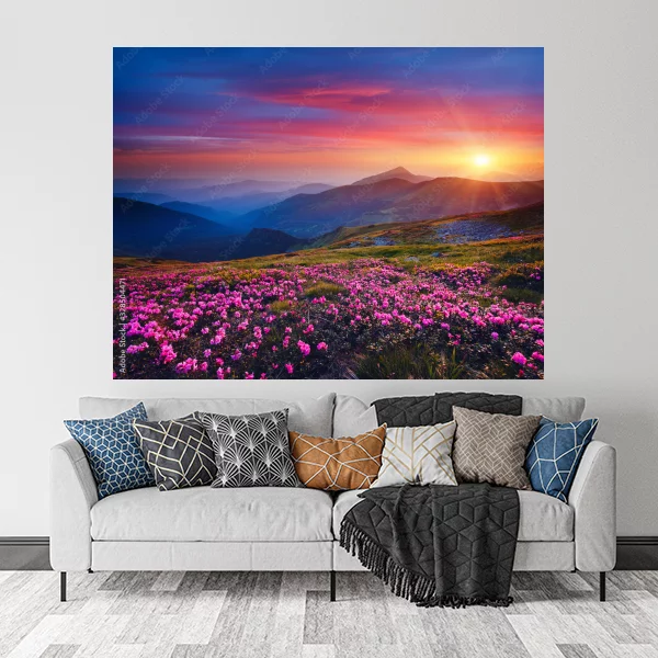 Obraz przedstawia malowniczy widok górski o zachodzie słońca. Na pierwszym planie widzimy pole różowych kwiatów, które dodają krajobrazowi żywych kolorów. W tle rozciąga się pasmo górskie, oświetlone ciepłym światłem zachodzącego słońca. Niebo jest pełne intensywnych odcieni pomarańczu, różu i fioletu, tworząc zachwycający, harmonijny klimat. To dzieło idealne do udekorowania wnętrza, wnoszące spokój i piękno natury.