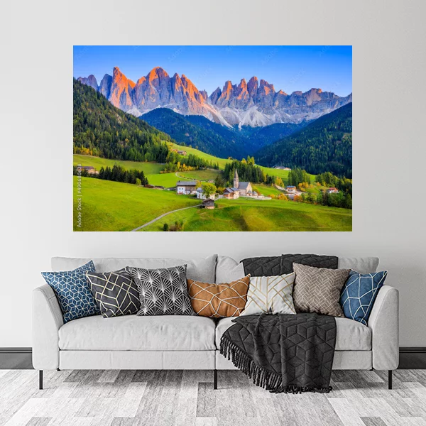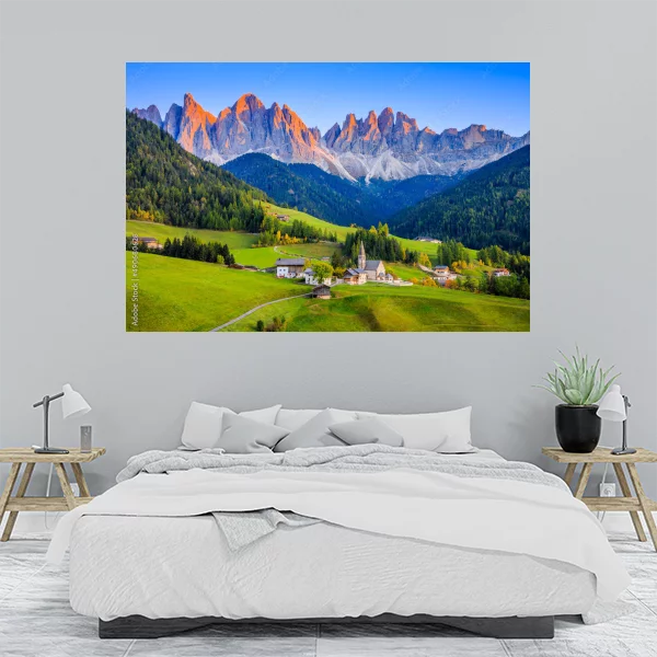Obraz przedstawia malowniczy krajobraz górski z wschodzącym słońcem, które subtelnie oświetla szczyty, dodając im ciepłych odcieni pomarańczu i różu. W dolinie widać niewielką wioskę z kościołem otoczonym zielonymi wzgórzami, co tworzy harmonijną i uspokajającą scenerię idealną do wnętrz. Ten obraz drukowany na płótnie świetnie sprawdzi się zarówno w salonie, jak i w sypialni, wprowadzając do pomieszczenia odrobinę natury i spokoju.