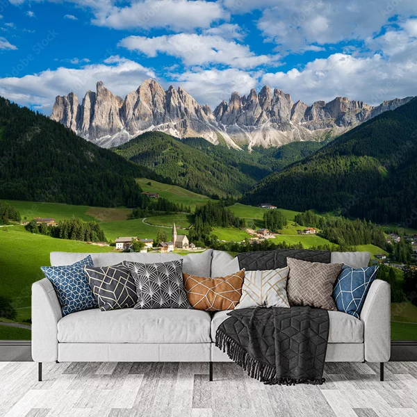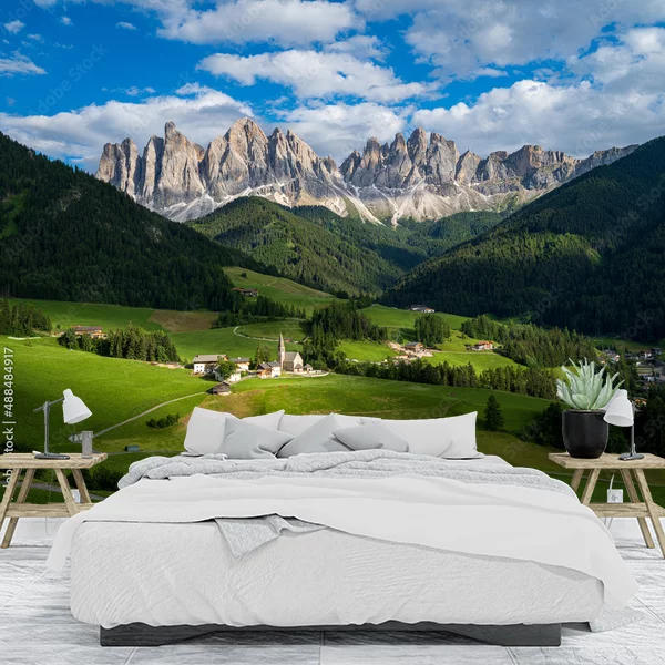 Fototapeta przedstawia malowniczy górski krajobraz. W tle widoczne są majestatyczne, skaliste szczyty górskie, pokryte niewielką ilością śniegu. Pod nimi rozciągają się bujne, zielone lasy. Na pierwszym planie widać urokliwą dolinę z zielonymi łąkami, poprzecinaną ścieżkami. W centrum znajduje się mała wioska z charakterystycznym kościołem o strzelistej wieży. Niebo jest błękitne, przetykane białymi, puszystymi chmurami. Całość tworzy spokojny, sielankowy widok, idealnie nadający się jako dekoracja ścian, aby wprowadzić do wnętrza naturalne piękno i harmonię.