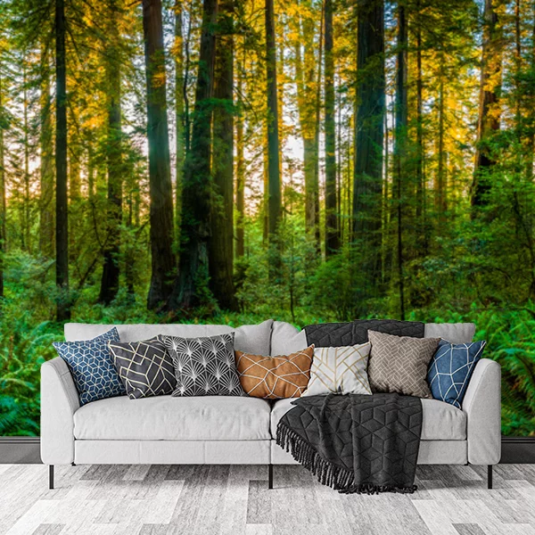 Ta fototapeta przedstawia gęsty las złożony z wysokich drzew o smukłych pniach, przez które przebijają się promienie słoneczne tworząc malownicze świetlne efekty. Podłoże lasu jest bujnie porośnięte paprociami i inną zielenią, co dodaje kompozycji dynamizmu. Obraz oddaje wrażenie spokoju i harmonii z naturą, doskonale nadaje się do wnętrz, które mają inspirować chwilami relaksu i wytchnienia. Taka tapeta może stworzyć iluzję głębi i przestrzeni, nadając pomieszczeniu naturalny i świeży wygląd.
