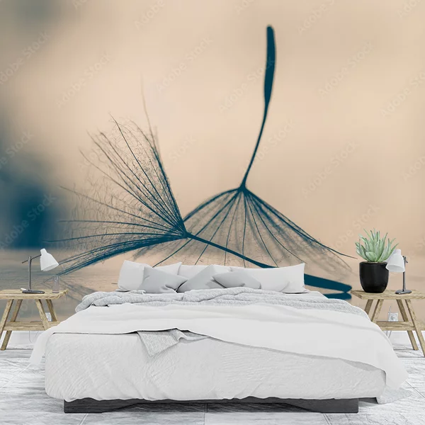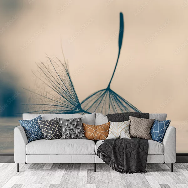 Obraz przedstawia makrofotografię dmuchawca, ukazującą dwa nasiona (spadochrony) na delikatnym, rozmytym tle. Jeden z dmuchawców jest pochylony na boki, a drugi stoi pionowo, co dodaje kompozycji subtelnej dynamiki. Dominują stonowane, monochromatyczne kolory: odcienie beżu, brązu i szarości, które nadają zdjęciu elegancki, minimalistyczny wygląd. Tło jest lekko rozmyte, co uwydatnia delikatność i drobne detale nasion dmuchawca, takich jak cienkie, włosowate struktury. Idealny jako fototapeta na ścianę, ten obraz może wprowadzić spokój, delikatność i naturalny urok do wnętrza.
