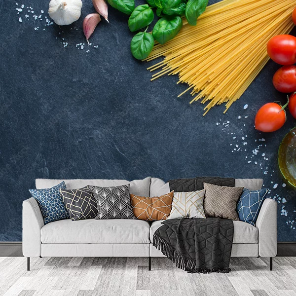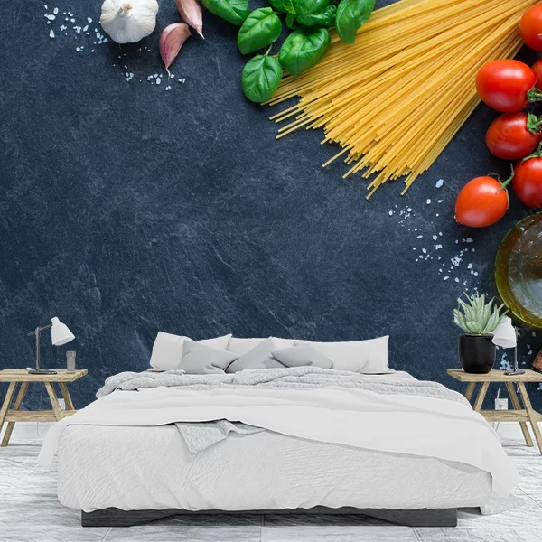 Obraz jest estetycznie ułożony, z elementami ułożonymi głównie w prawym górnym rogu, co pozostawia sporo miejsca na ciemnym tle. Taka fototapeta doskonale nadaje się do kuchni, podkreślając inspirację włoską kuchnią i nadając wnętrzu atmosferę pełną aromatów i świeżości.