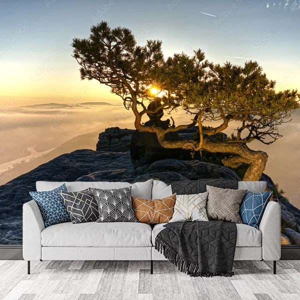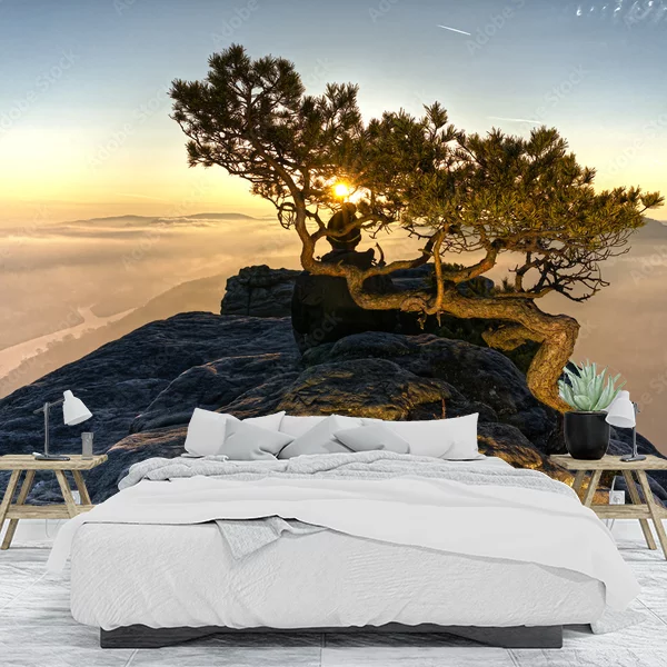 Ten obraz doskonale nadaje się na fototapetę, która stworzy niepowtarzalny klimat w każdym wnętrzu. Przedstawia malowniczy krajobraz, gdzie niewielkie drzewo wyrasta na skalistym szczycie góry o wschodzie lub zachodzie słońca. Promienie słońca przebijają się przez gałęzie, co tworzy niezwykły efekt świetlny. W tle widać mglistą dolinę z wijącą się rzeką, co nadaje obrazowi tajemniczości i głębi. Taka fototapeta wprowadzi do pomieszczenia spokój i harmonijną atmosferę, idealną do relaksu.