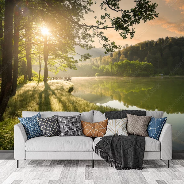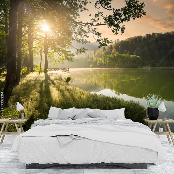 Na fototapecie widoczny jest malowniczy krajobraz jeziora o poranku. Promienie słońca delikatnie przenikają przez korony drzew, tworząc ciepłą, złocistą poświatę. Drzewa po lewej stronie rzucają długie cienie na trawiasty brzeg, wnosząc do obrazu poczucie głębi i spokoju. Woda jeziora jest spokojna, odbijając otaczającą zieleń i błękitne niebo z delikatnymi chmurami. W tle rysuje się zalesiony wzgórza, dodając kompozycji naturalnego uroku. Fototapeta idealnie oddaje atmosferę ciszy i harmonii przyrody.