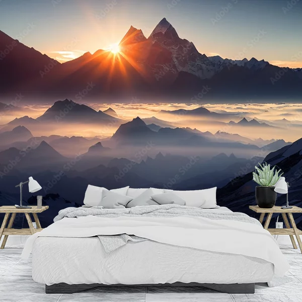 Ten obraz przedstawia zapierający dech w piersiach górski krajobraz, idealny jako fototapeta na ścianę. Na pierwszym planie widać majestatyczne góry pokryte śniegiem, które rozpościerają się na horyzoncie. W tle, zza jednego z szczytów, wyłania się intensywne, pomarańczowe światło wschodzącego słońca, zalewając doliny ciepłym blaskiem. Delikatna mgła osiadła pomiędzy wzgórzami, dodając krajobrazowi tajemniczości i głębi. Ten obraz oddaje piękno i spokój natury, tworząc atmosferę relaksu i inspiracji. Idealnie nadaje się do stworzenia wyjątkowej atmosfery w każdym pomieszczeniu.
