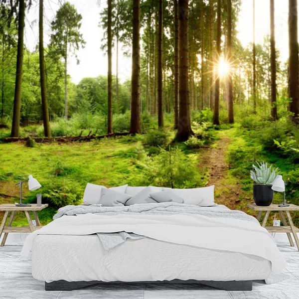To obraz przedstawiający malowniczy las w promieniach słońca. Wysokie, smukłe drzewa tworzą przestronne sklepienie, przez które przedzierają się promienie światła, tworząc piękną grę cieni i refleksów. Gęsta, zielona roślinność pokrywa podłoże, dodając głębi i różnorodności. Taka fototapeta na ścianę wniesie do wnętrza spokój oraz harmonię, tworząc przyjemną, naturalną atmosferę przypominającą o urokach przyrody. Idealnie nadaje się do salonu, sypialni lub gabinetu, tworząc relaksujący i inspirujący klimat.