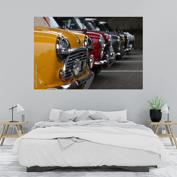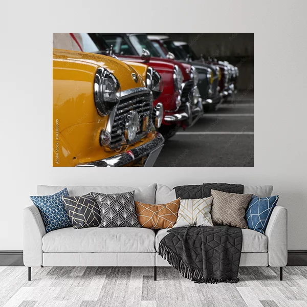 Obrazek przedstawia rząd klasycznych samochodów w żywych kolorach, co nadaje mu unikalny retro charakter. To doskonały wybór do wnętrz dla miłośników motoryzacji oraz stylu vintage. Świetnie sprawdzi się zarówno w salonie, jak i w sypialni, wprowadzając dynamiczny element dekoracyjny.