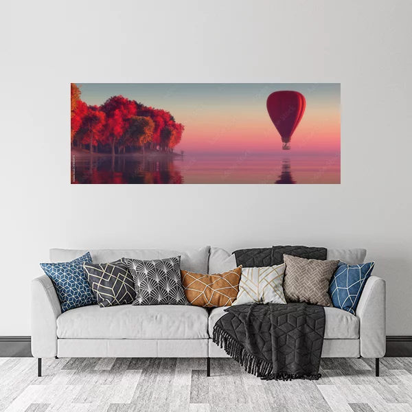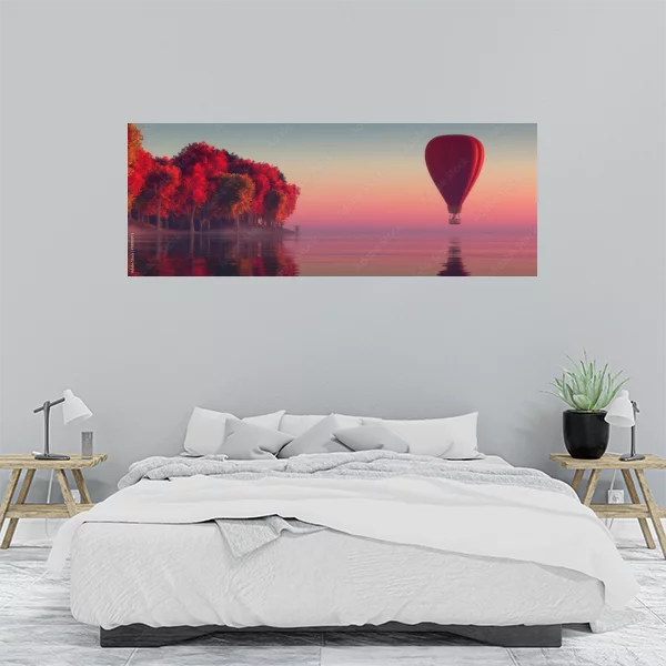 Obraz przedstawia urokliwy krajobraz, który wyróżnia się pięknymi, nasyconymi kolorami. Po lewej stronie obrazu znajduje się wybrzeże jeziora z drzewami w jesiennych barwach – intensywnych odcieniach czerwieni, pomarańczu i żółci. Drzewa odbijają się w spokojnej tafli wody, dodając scenie malowniczości. Na prawym tle obrazu unosi się czerwony balon na ogrzane powietrze, zawieszony nad spokojną, lustrzaną powierzchnią jeziora. Niebo jest pastelowe, tonące w odcieniach różu i fioletu, co tworzy nadzwyczajny, romantyczny nastrój. Ten obraz z pewnością przyciąga wzrok i wprowadza do wnętrza atmosferę spokoju oraz piękna natury.