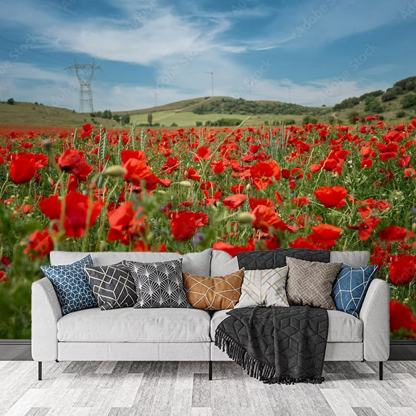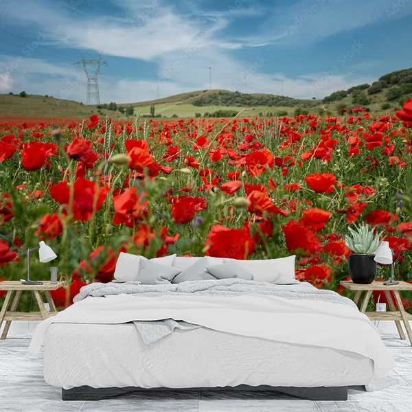 Fototapeta przedstawia rozległe pole pełne intensywnie czerwonych maków, które tworzą żywy, kolorowy dywan rozciągający się aż po horyzont. Tło obrazu stanowią delikatnie pofałdowane wzgórza pokryte zielenią, a błękitne niebo z białymi obłokami dodaje całości lekkości i spokoju. Widoczne są także odległe linie energetyczne, wprowadzające nowoczesny akcent do naturalnego krajobrazu. Całość tworzy harmonijną i relaksującą atmosferę idealną do wnętrza, w którym chcemy stworzyć wrażenie przestrzeni i bliskości natury.